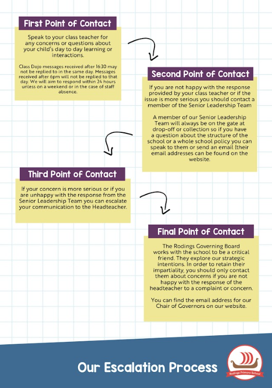 Although we try our best, there will be times when you have questions or want to raise queries about the education your child receives at Rodings. We believe in positive dialogue between home and school to make a really strong partnership with the best outcomes for all.